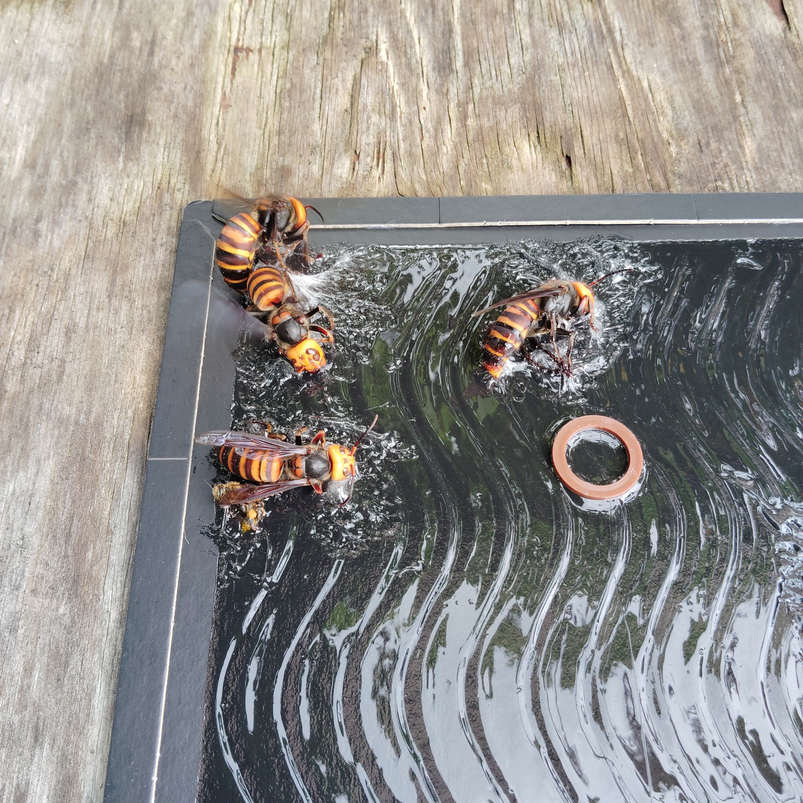 予想通り何箱も大スズメバチの襲撃を受けていたが、見回りのタイミングが良かったので一番酷い被害で20匹程度で済んだ。午前中に2回見回りを行い、その後は給餌。夕方にもう1度見回りをして本日は終了。
