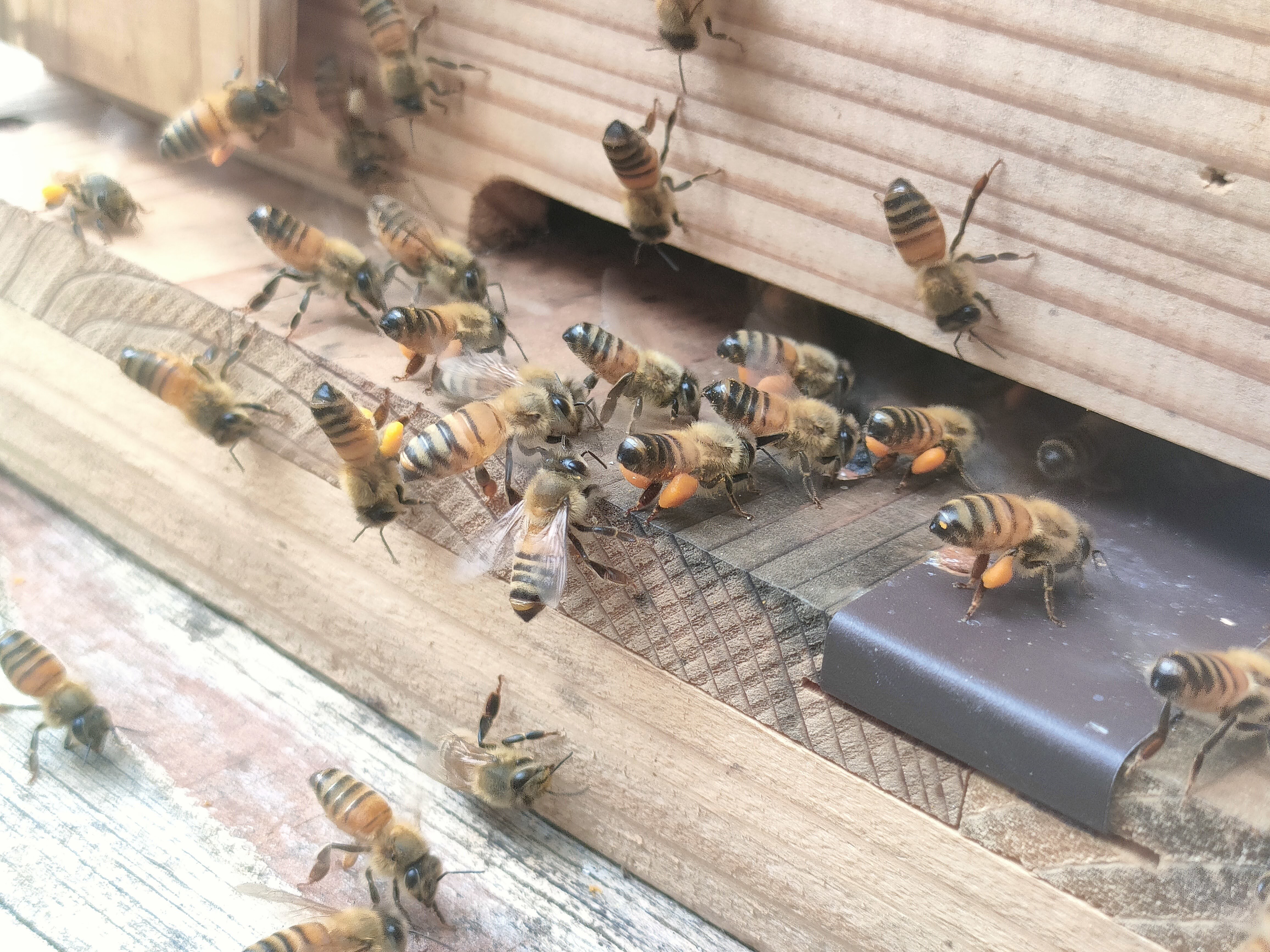 予報が外れ朝から小雨。昼前には止むだろうと思い巣箱の洗浄から作業を開始した。10時半頃に雨が上がったので、直に見回りを開始。今日も襲撃は激しいぞ!!全力でミツバチを守るぞ。気合充分。