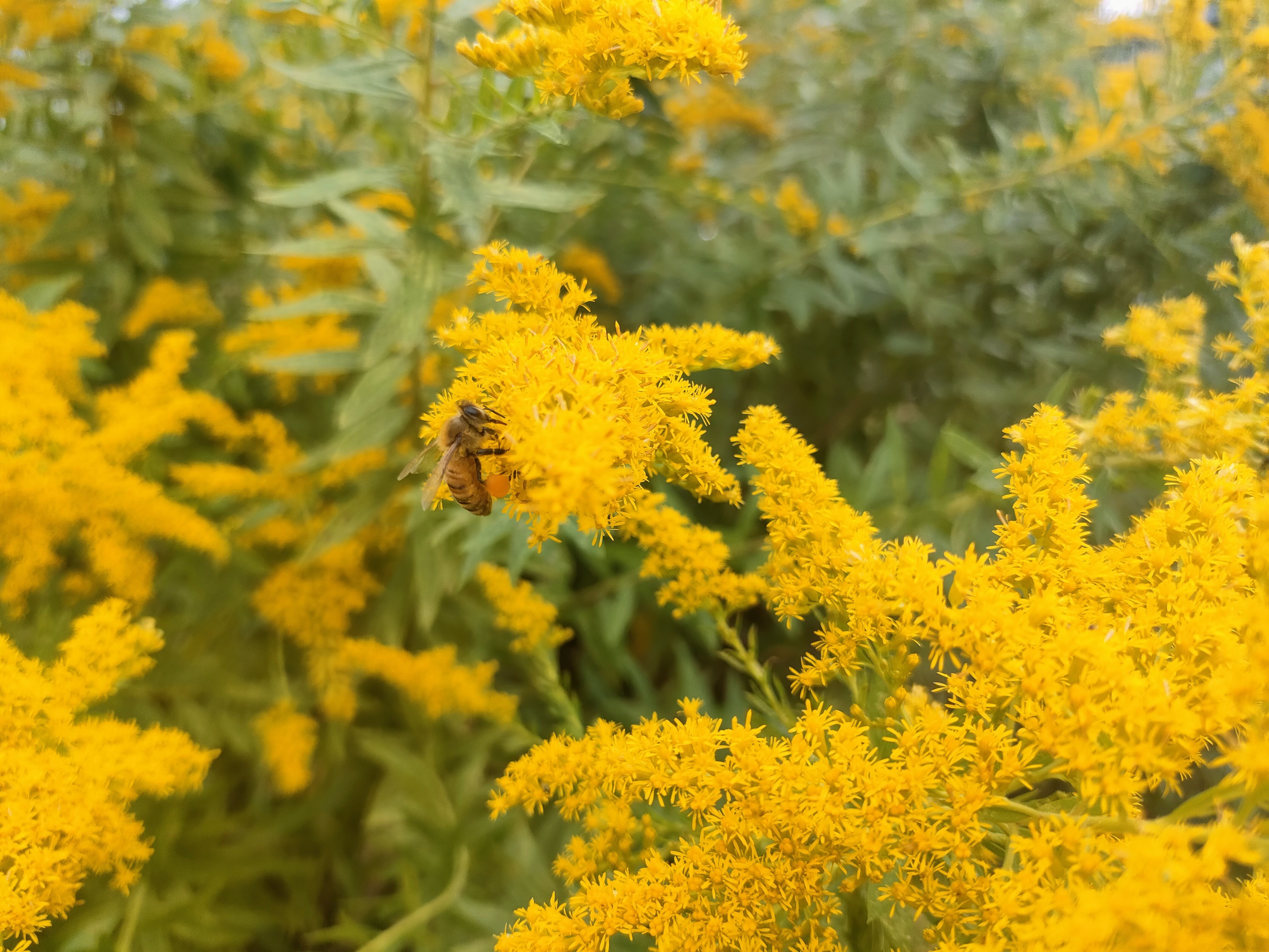 アワダチソウが満開を向かえ、ミツバチの行動も活発になっている。