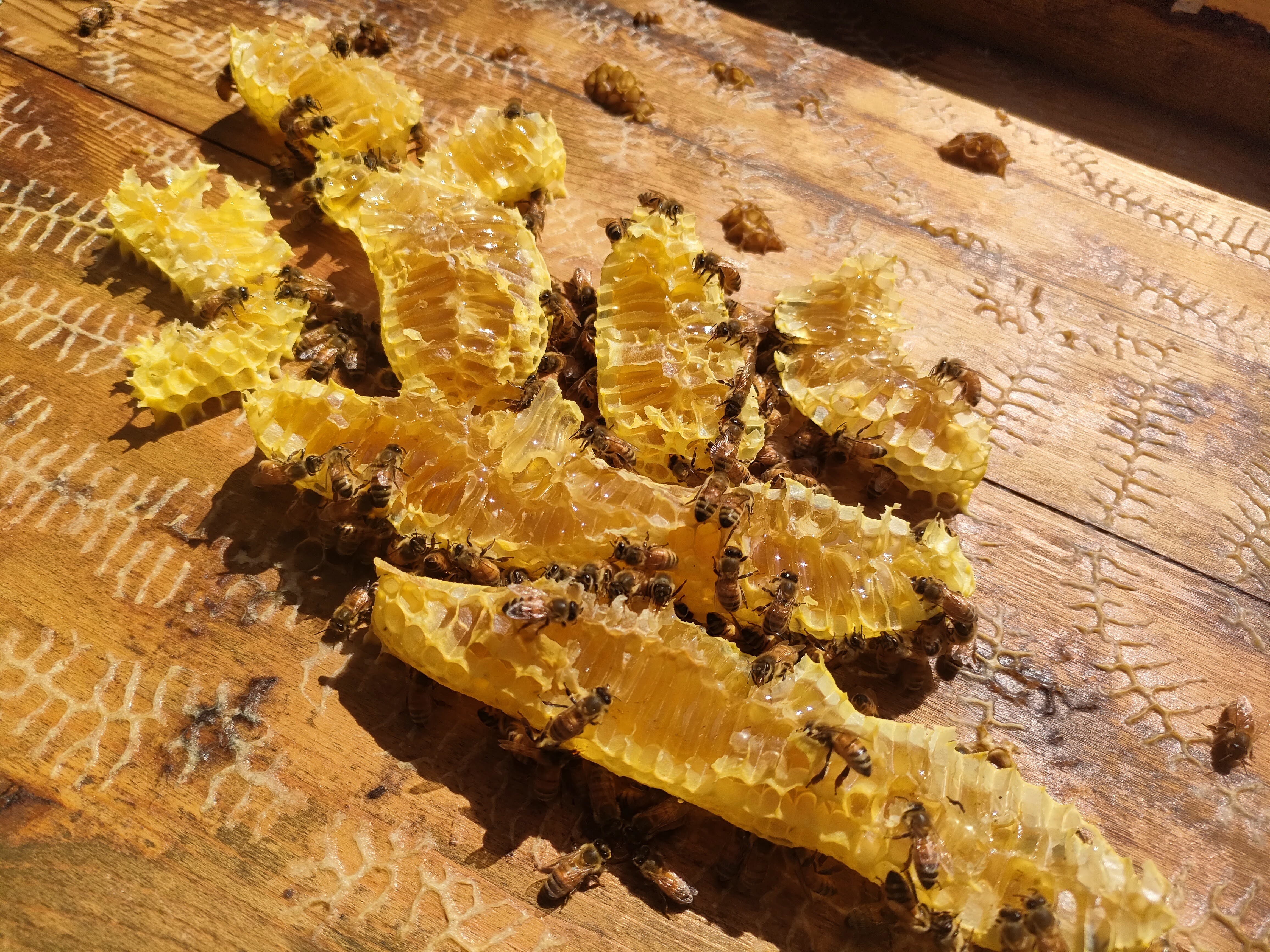 10月中は毎日同じ流れ。全蜂場を見回りしてから内検。現在の内検では、アピバールの撤去、ドローンドロップ、貯蜜の確認を行っている。貯蜜が充分になった群は自然巣を盛っている。