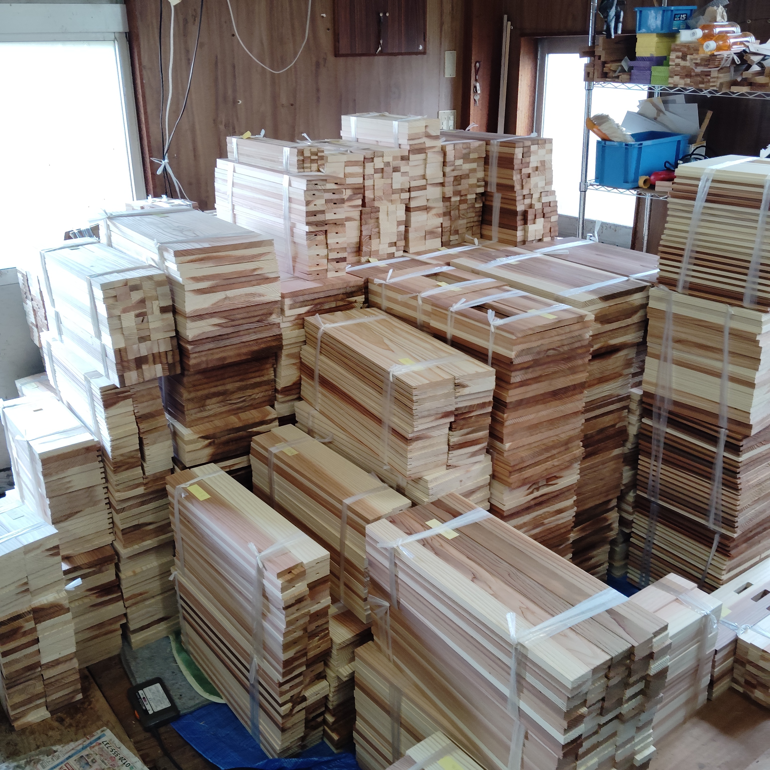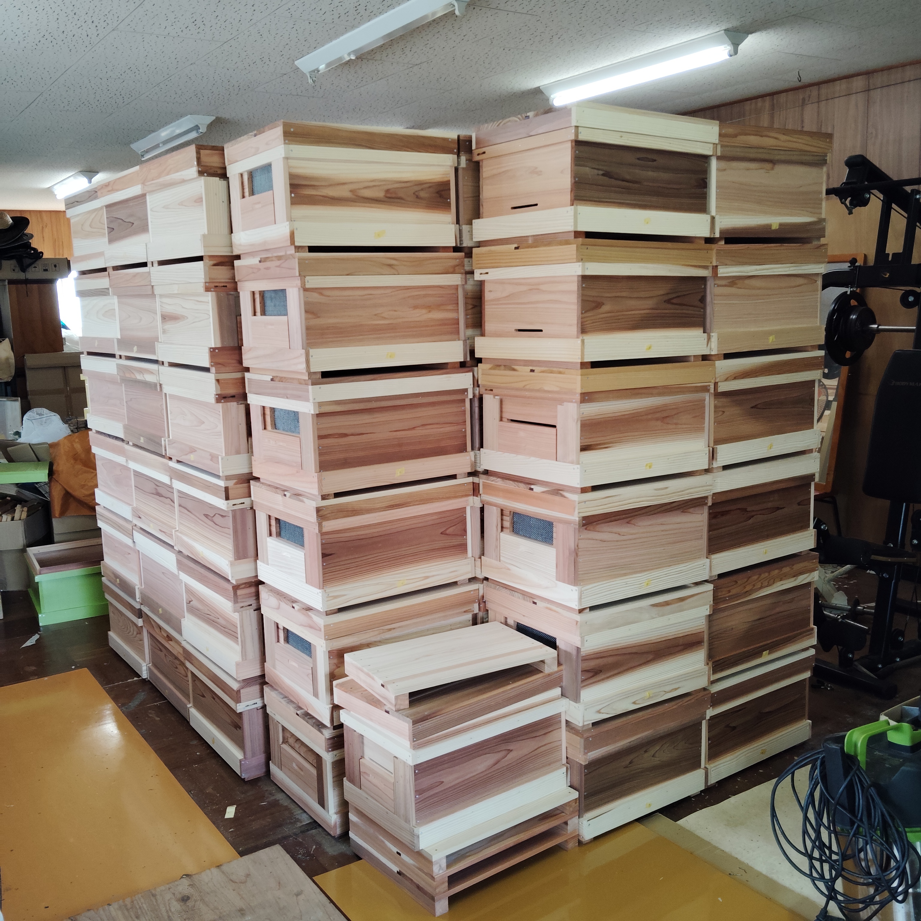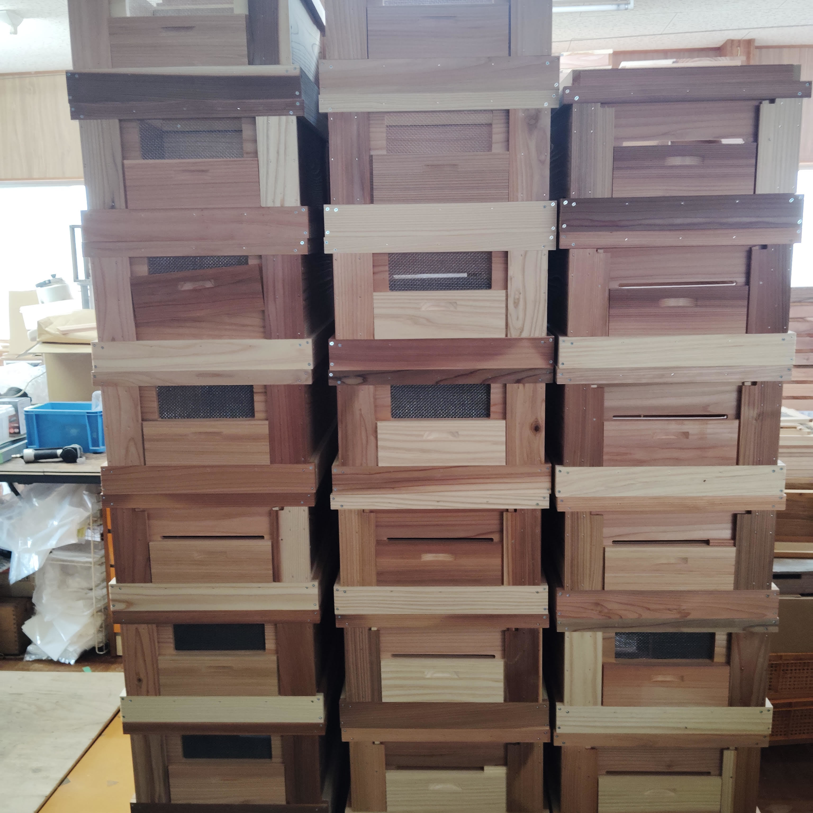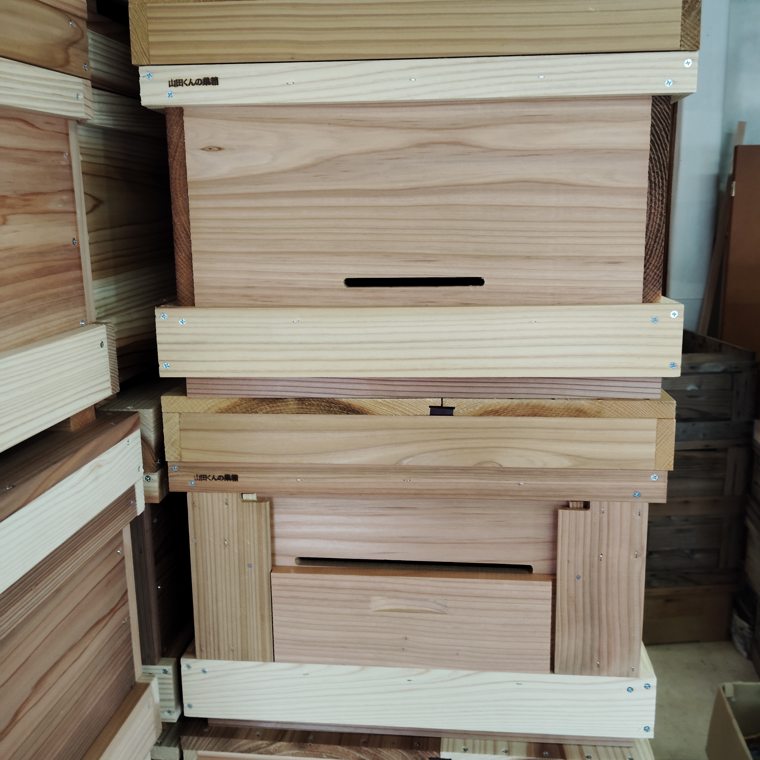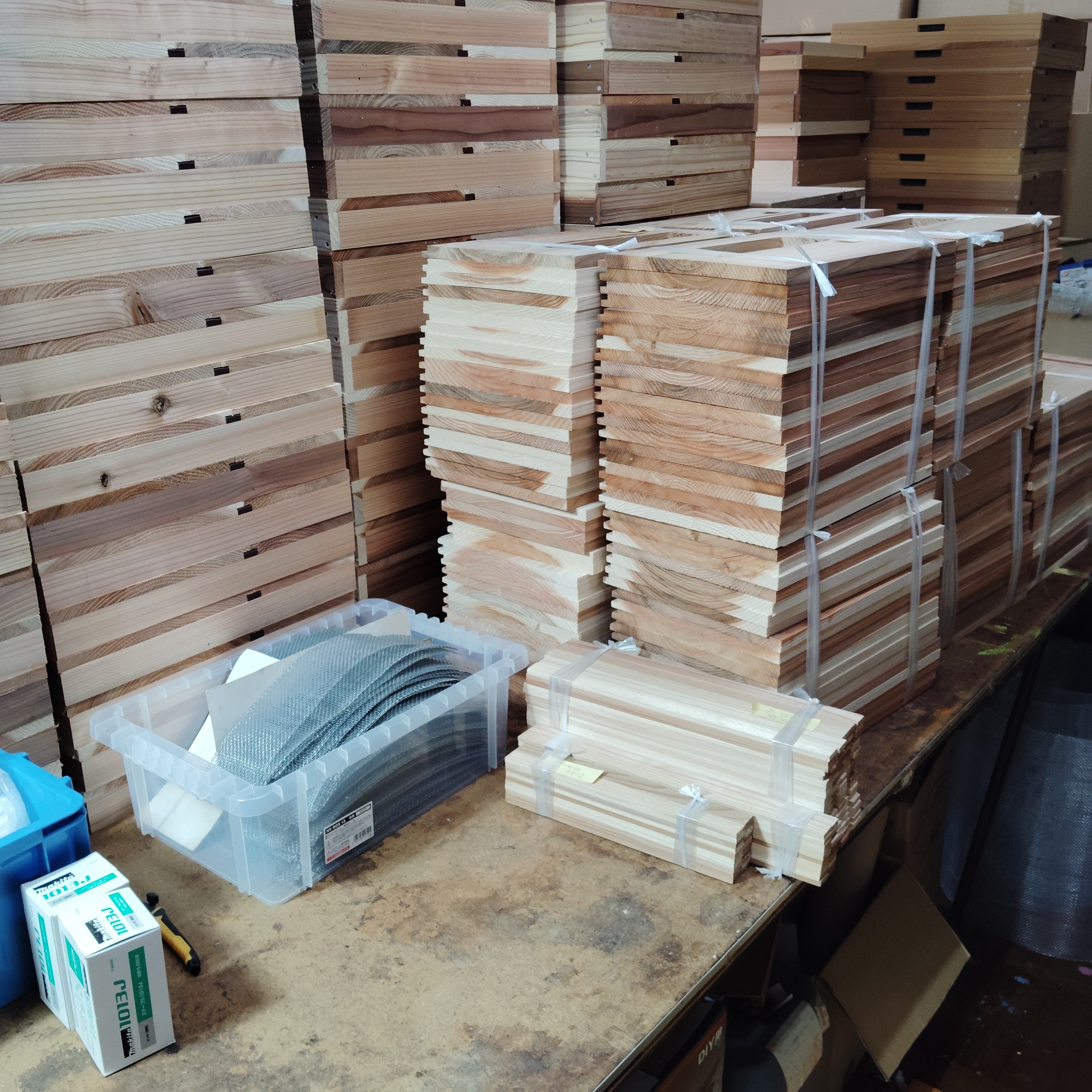 カラフル巣箱3個、定飼専用10枚巣箱2箱、山田くんの7枚箱10箱、山田くんの10枚箱100箱が完成。