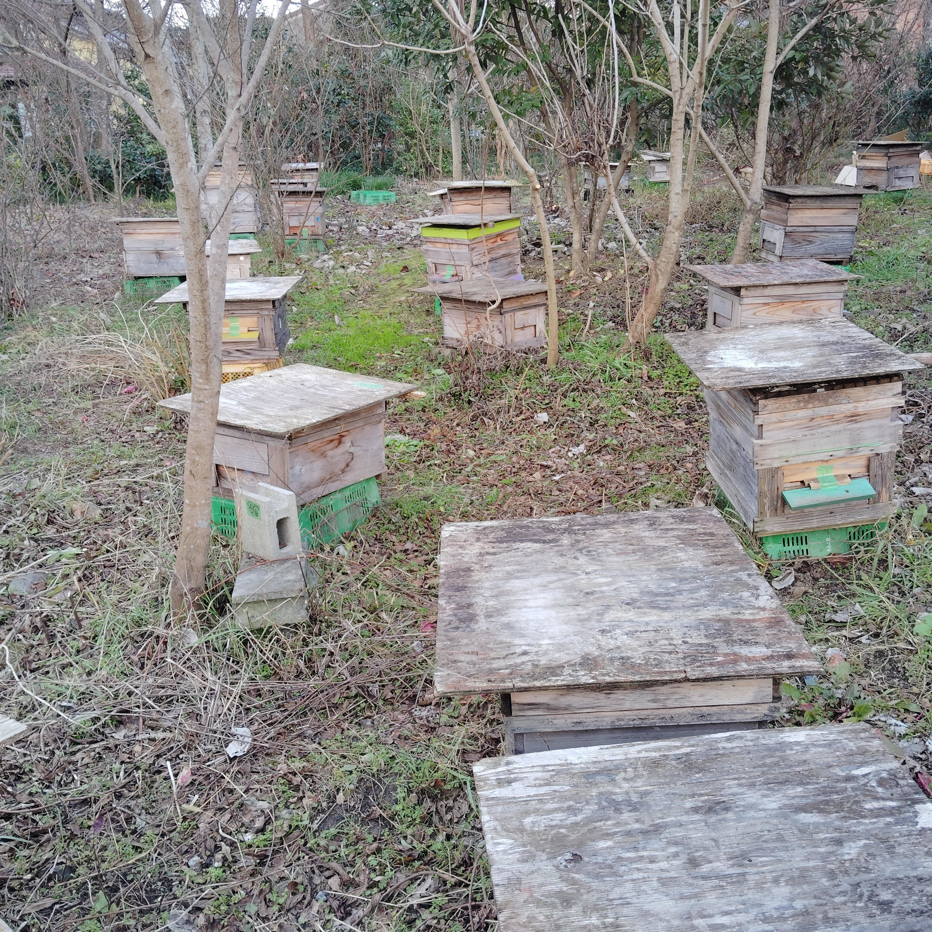 外の作業:巣箱洗浄、捕殺器の撤去と洗浄、片付け。蜂場の草刈、ブロックなどの整理、貯蜜の確認など。