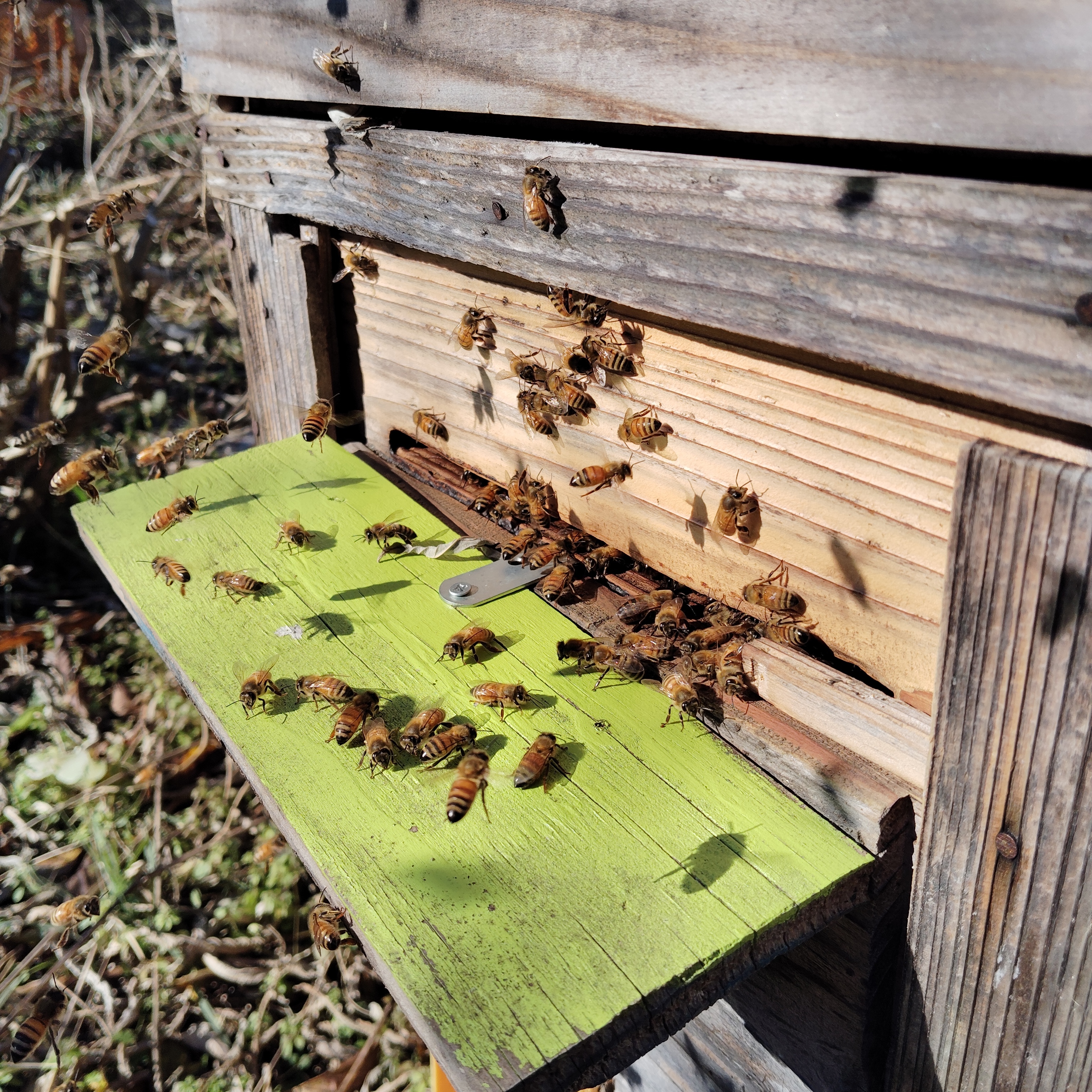 温かい日だった。温かい日は蜜蜂が脱糞飛行を行なうので見回りは欠かせない。温かくなるまでは巣箱作り。温かくなり羽音が聞こえるようになったら見回り開始の合図。