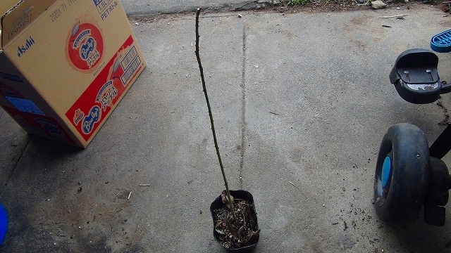 ↑到着したカラスザンショの様子。小さいので落葉時に枝ごと落とすので見た目はただの棒のようですが、先をよく見ると新芽が有ります。