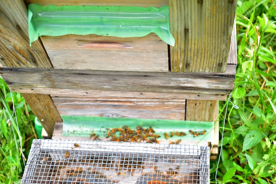 ↑2階の巣門が充分に塞がっていないため蜜蜂が大スズメバチと戦ってしまい犠牲が出てしまいました。※巣門をしっかりと塞いだ後の様子。