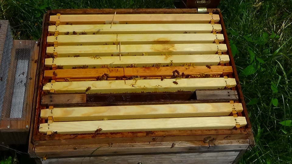 本日は、見回り→内検→女王蜂導入の順番で作業を行いました。女王蜂は血統がとても大切です。どうしても調子が悪い血統がいるので、働き蜂の一部を分けてもらい女王蜂を導入することにしました。