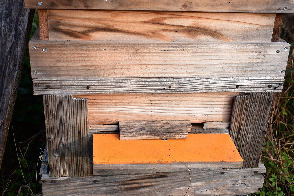 従来型の巣箱は板を使って巣門の幅を狭めた。