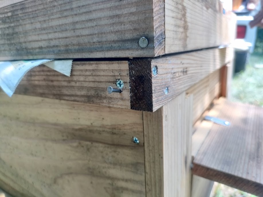 側面のハチマキ(左右に1本ずつ)に32mmの釘を2cm程打ち込みます。この釘に捕殺器の針金を引っ掛けて巣箱に固定します。